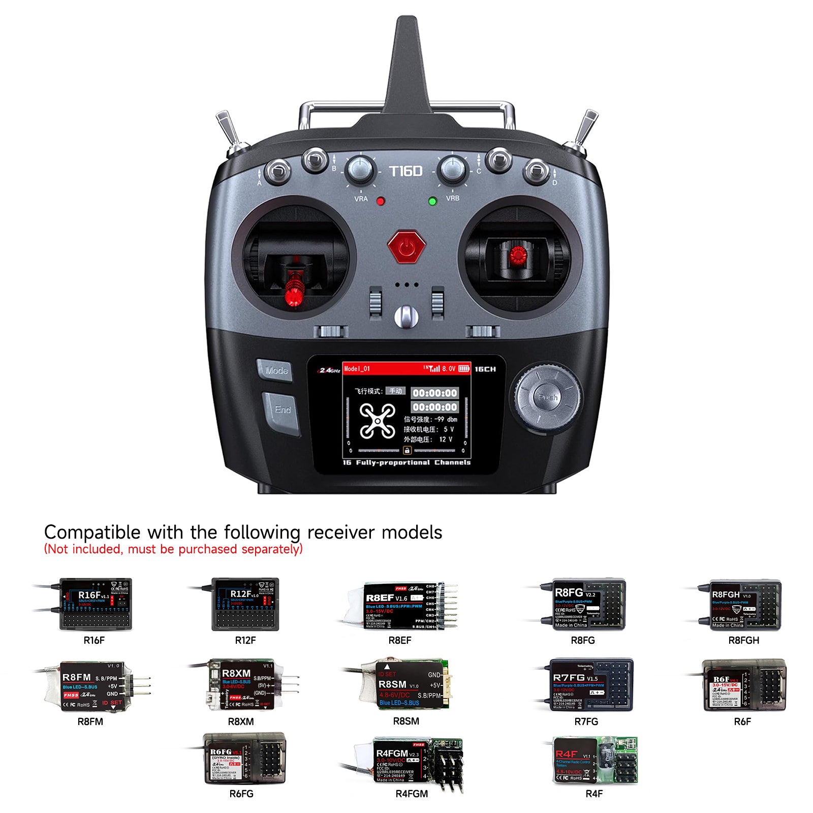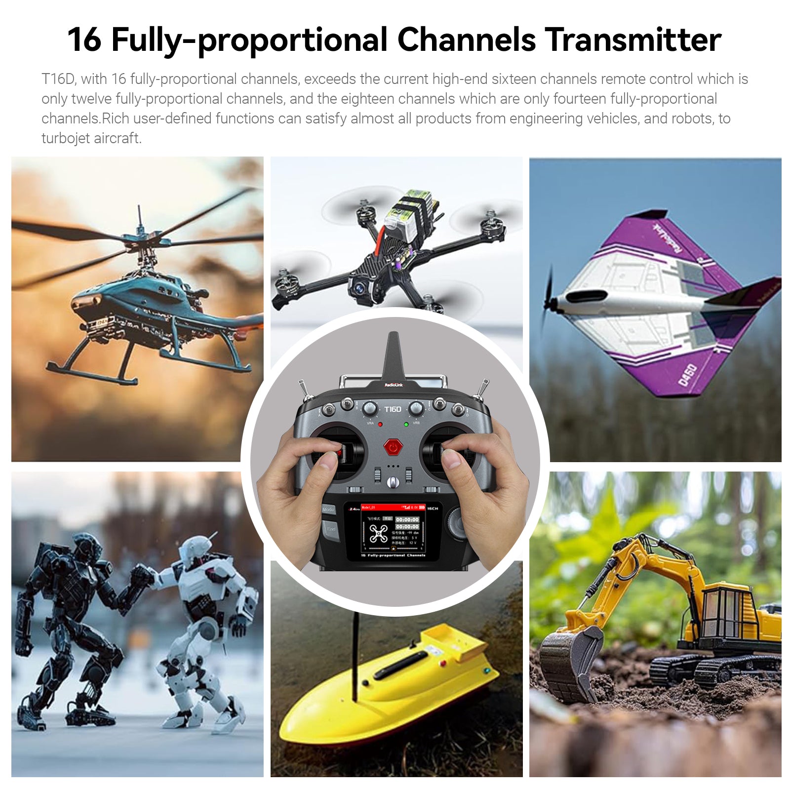 T16D, with 16 fully-proportional channels, exceeds the current high-end sixteen channels remote control which isonly twelve fully-proportional channels, and the eighteen channels which are only fourteen fully-proportional channels.Rich user-defined functions can satisfy almost all products from engineering vehicles, and robots, to turbojet aircraft.